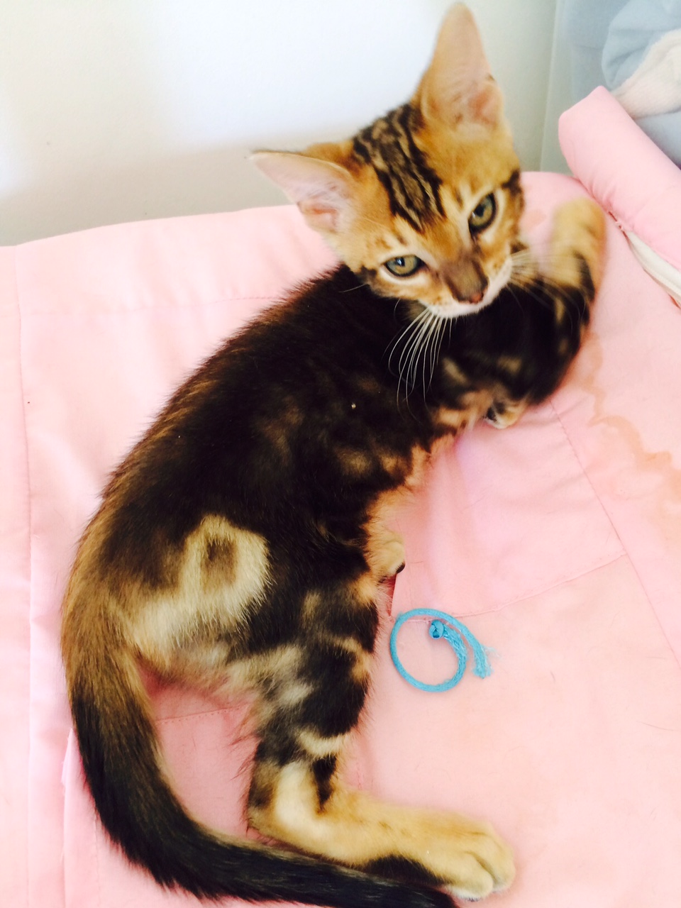Det här är vår lilla lakritspuck Firefly, han är nu över 10 veckor och letar efter sitt nya hem med lite nya roliga människor. Han är en underbar liten kille som spinner och gosar och faktiskt gillar att bli buren och sitta i knät. Han är ju marble i mönstret men så mycket marmorering ser man inte utan han har fått två likadana markeringar på var sida på rumpan. Dessutom har han två svarta prickar på frambenen mitt i det ljusa innan tassen börjar. Men han verkar helt nöjd med det och far runt som en raket och leker och äter och sover precis som vilken bengalning som helst.